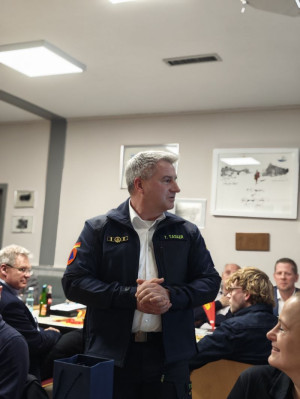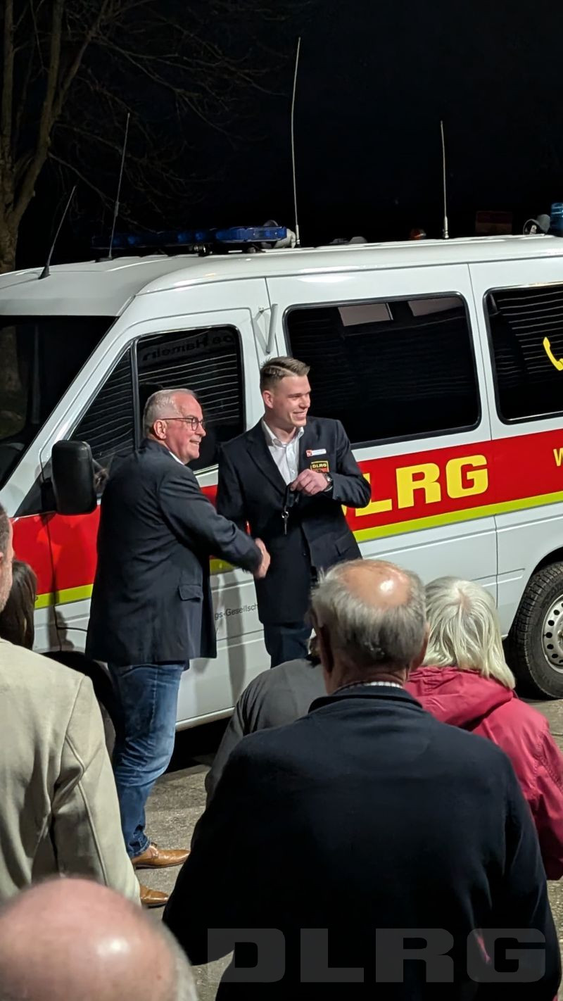 Den Abschluss bildete die Indienststellung unseres neuen Mannschaftstransportwagens (MTW), der künftig unseren Bulli ersetzen wird. Feierlich übergab Peter Breitkopf dabei den Fahrzeugschlüssel an unseren Leiter Einsatz, Maximilian Meyer.